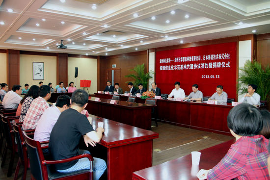 胡璋劍、平林(lín)武昭和(hé)阮立新代表三方簽署了(le)協議(yì),并共同為(wèi)"湖(hú)州師(shī)範學院-湖(hú)州日(→rì)華信息科(kē)技(jì)有(yǒu)限公司、日(rì)本系統技(jì)術(shù)株式會(huì)社校(xiào)園信息化(huà)示範基地(d>ì)"揭牌。