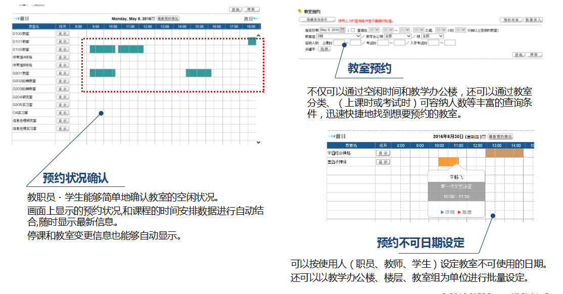 和(hé)教務系統的(de)時(shí)間(jiān)安排數(shù)據進行(xíng)自(zì)動結合、能(néng)夠随時(shí)把握教室的(de)空(kōng)閑λ狀況,并進行(xíng)教室預約。