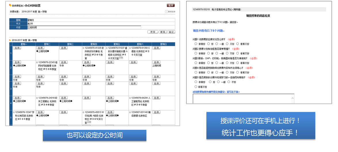通(tōng)過JAFOS 學生(shēng)信息服務系統可(kě)以進行(xíng)辦公時(shí)間(jiān)的(de)設定、授★課的(de)評價。
