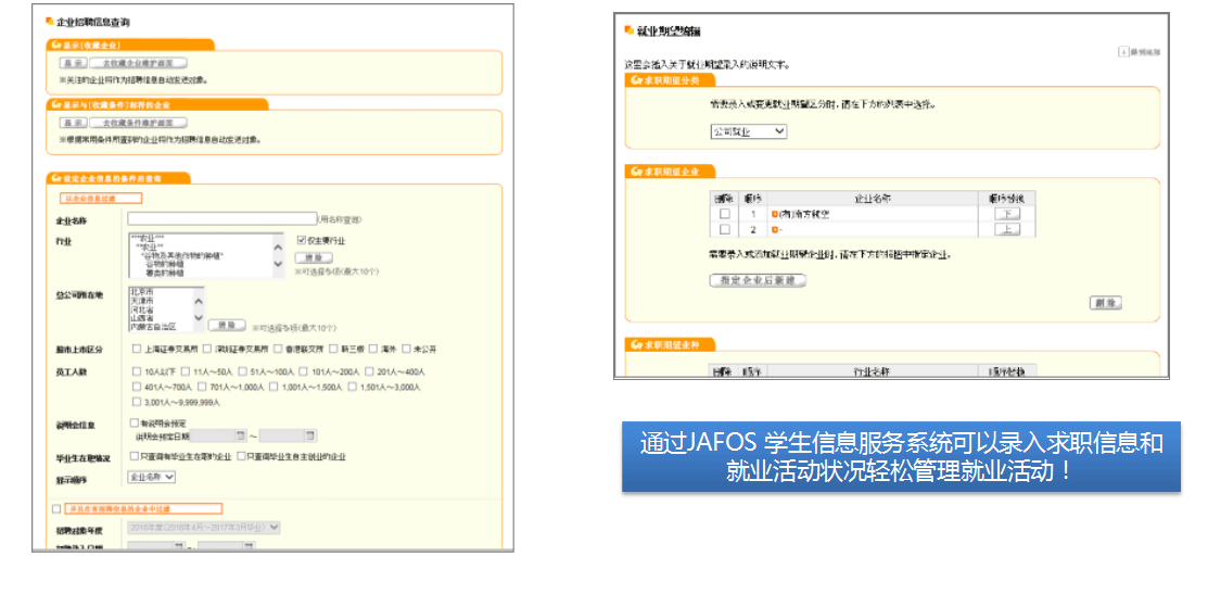 支持一(yī)般企業(yè)查詢、招聘信息查詢、另外(wài)還(hái)支持報(bào)名學生(shēng) /求職活動狀況的(de)錄入功能(néng),對(duì)求職活動提供全面支持。
