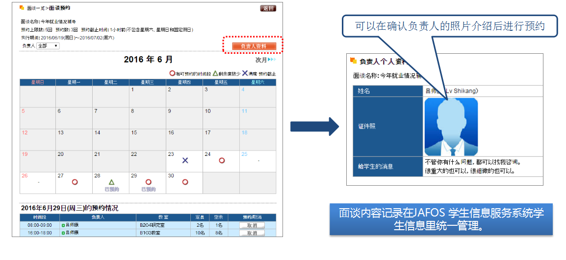 學生(shēng)能(néng)夠确認面談主題和(hé)面談者照(zhào)片的(de)同時(shí),€通(tōng)過網絡預約面談。