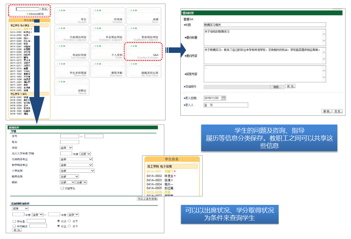 教師(shī)、學生(shēng)工(gōng)作(zuò)處可(kě)以共享學生(shēng)的(de)問(wèn™)題及面談・指導履曆等信息。