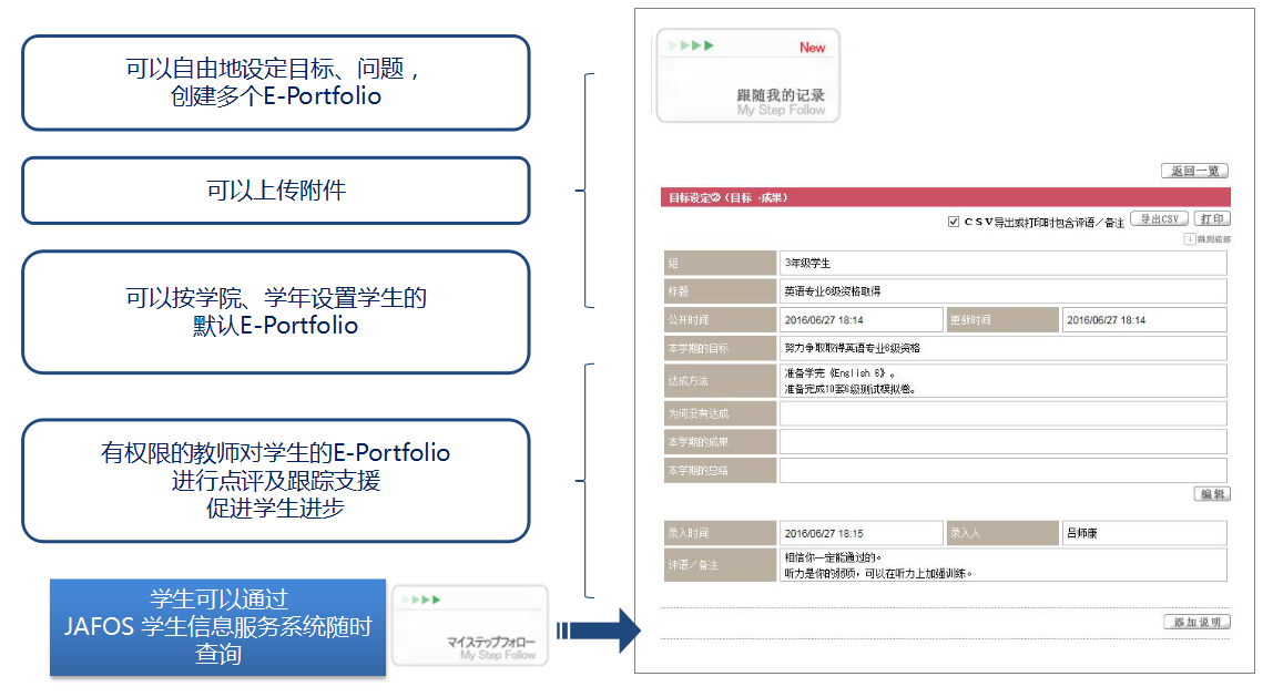 對(duì)學生(shēng)創建自(zì)己的(de)大(dà)學生(shēng)活E-Portfolio進行(xíng)支持,讓學生(shēng)切實感受<到(dào)自(zì)己的(de)成長(cháng)。